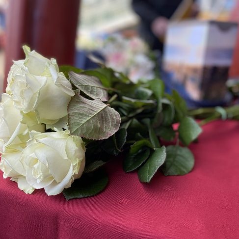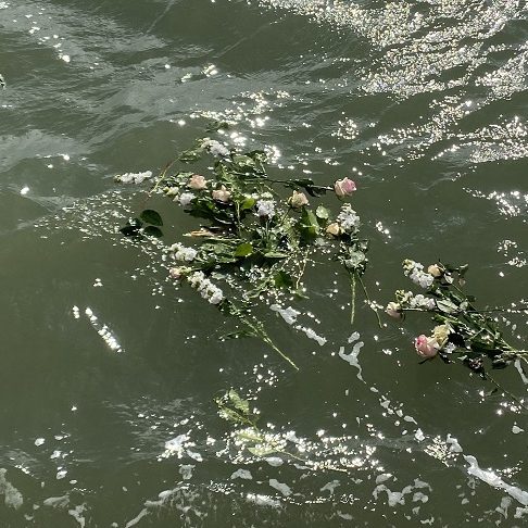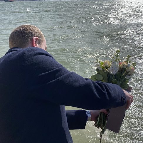 Tijdens deze asverstrooiingsceremonie zijn er verschillende bloemengroeten gegeven in opdracht van nabestaanden direct en via crematoria. De laatste bloemengroet, de 10 witte rozen, is gegeven namens ~Aqua-Omega voor iedereen die vandaag op zee is gebleven. Na deze laatste bloemengroet is het schip een cirkel om de bloemen gevaren en heeft de scheepshoorn driemaal geklonken. Daarna is de vlag in top gehesen en zijn wij teruggekeerd naar de haven van Scheveningen.