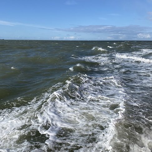 Hierdoor een mooie schittering van de zon op het zeewater. Een rustig deinende zee, eerste weinig tot geen stroming, later een sterke stroming naar het noorden (vloed).